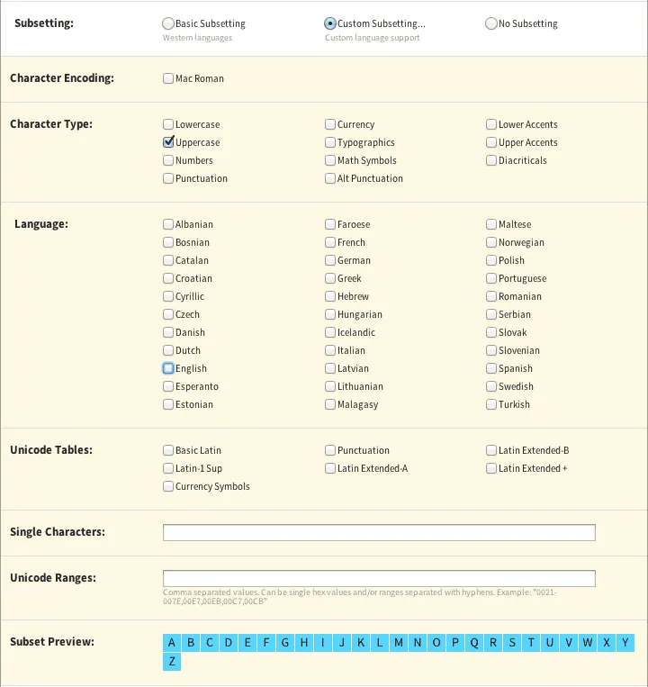 Também é possível usar subconjuntos de fontes através de seu próprio servidor criando uma fonte personalizada que contenha somente os glifos necessários.